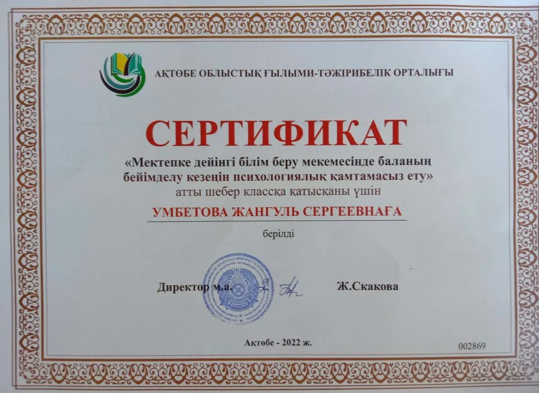 Ақтөбе облыстық ғылыми -тәжірибелік орталығы ұйымдастырумен "Мектепке дейінгі білім беру мекемесінде баланың бейімделу кезеңін психологиялық қамтамасыз ету " атты шығармашылық классқа психолог Үмбетова Ж.С.қатысып, сертификат алды