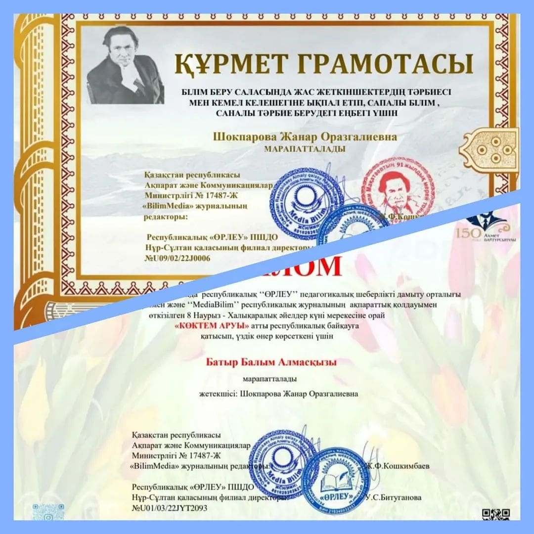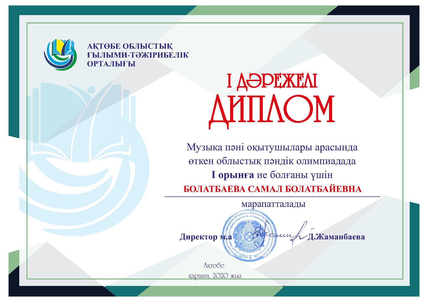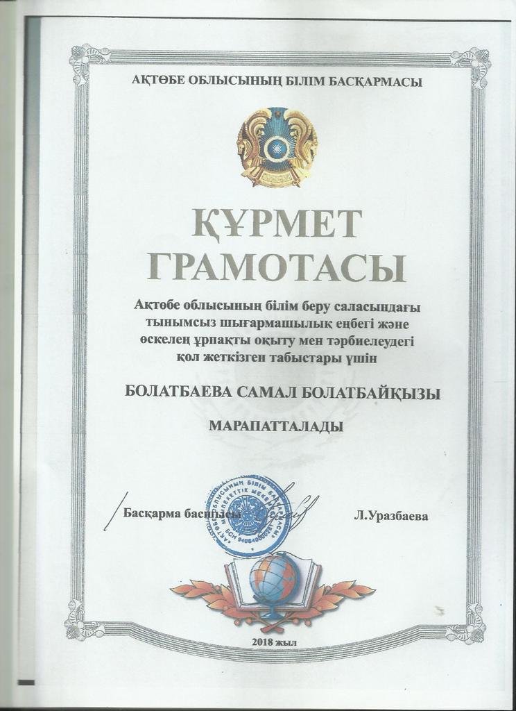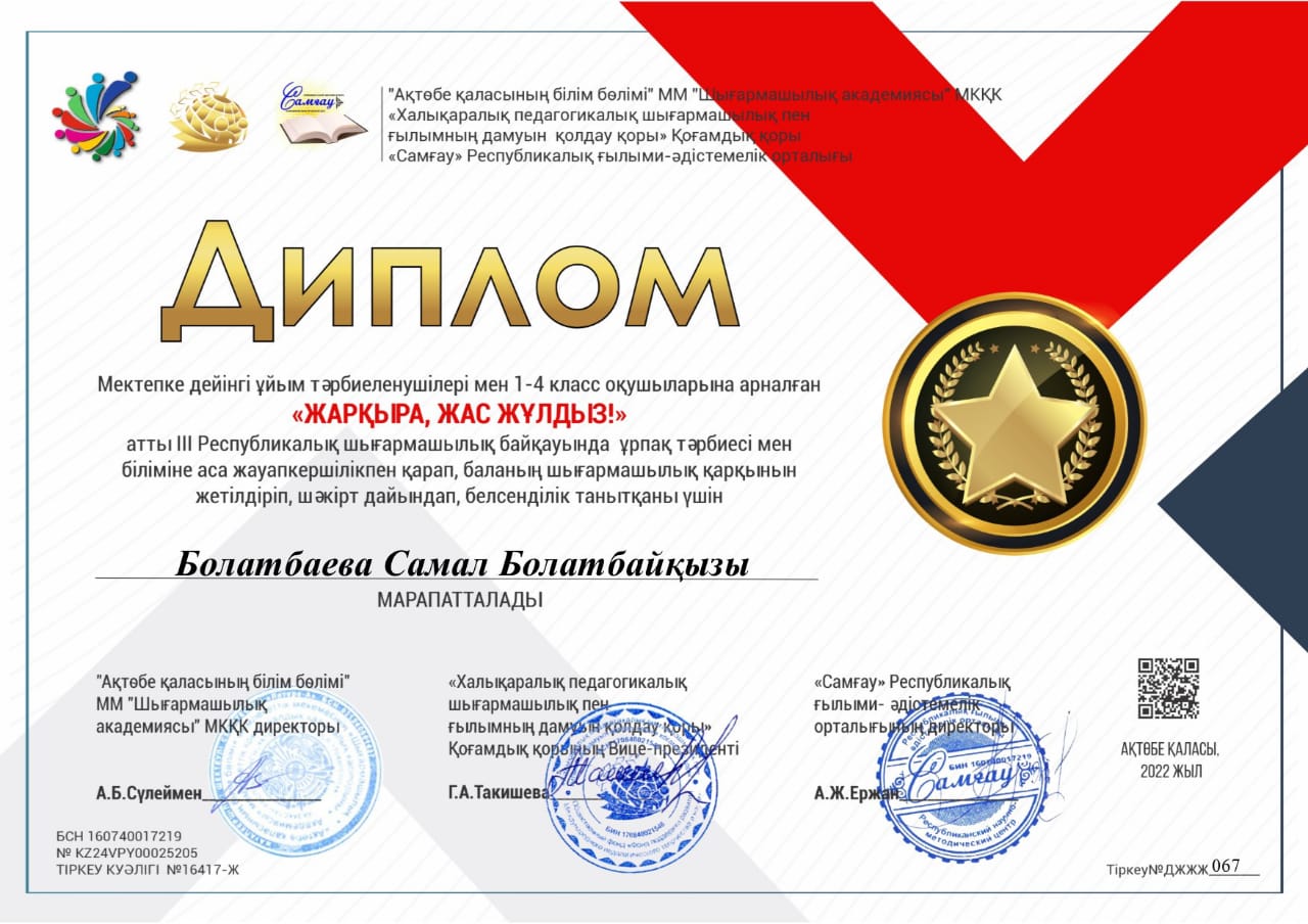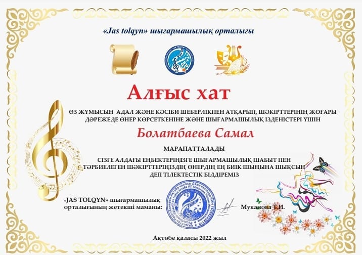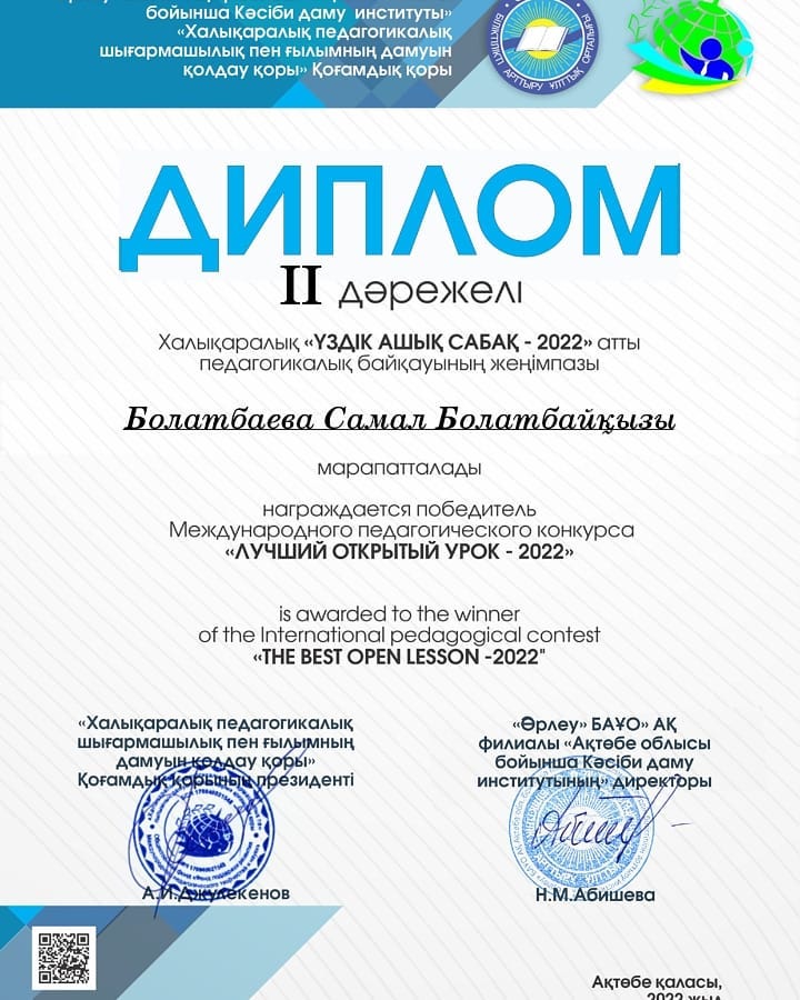 "Өрлеу" БАҰО "АК филиалы Ақтөбе облысы бойынша Кәсіби даму институты" мен "Халықаралық педагогикалық шығармашылық пен ғылымның дамуын қолдау қоры" Қоғамдық қорының ұйымдастыруымен өткен Халықаралық "ҮЗДІК АШЫҚ САБАҚ-2022" педагогикалық байқауында БОЛАТБАЕВА САМАЛ БОЛАТБАЙҚЫЗЫ 2 Дәрежелі дипломмен марапатталды.