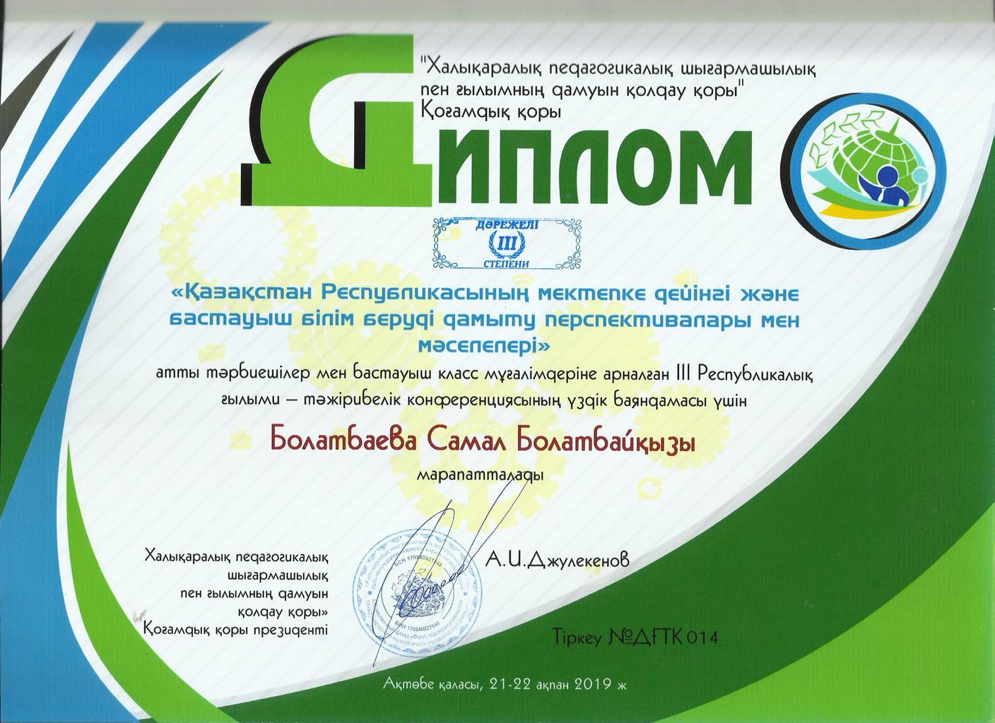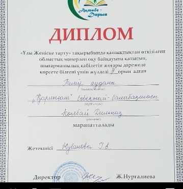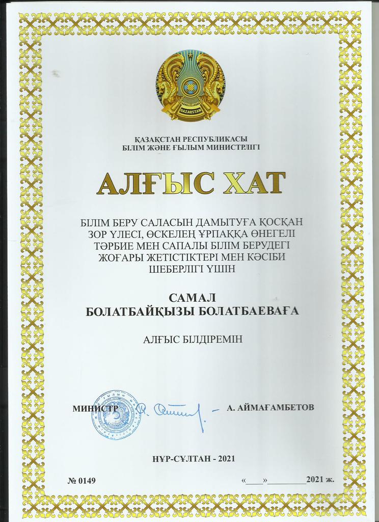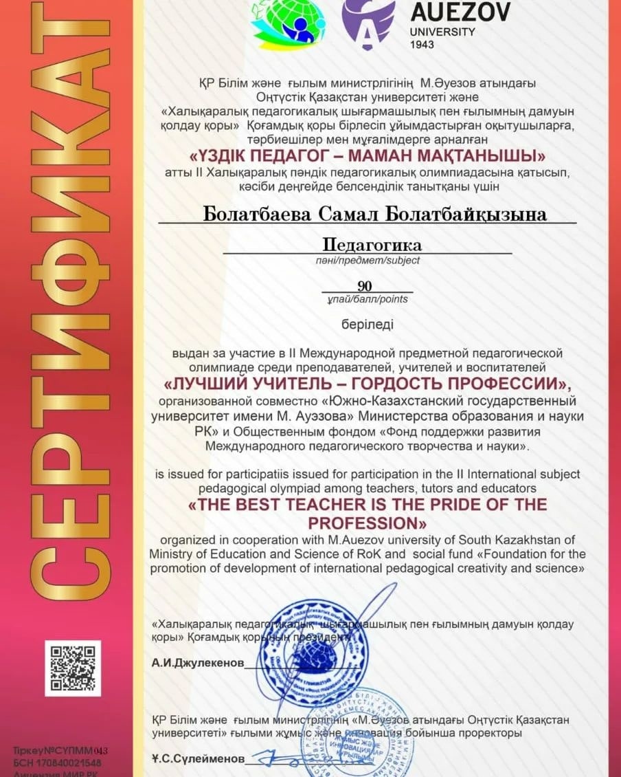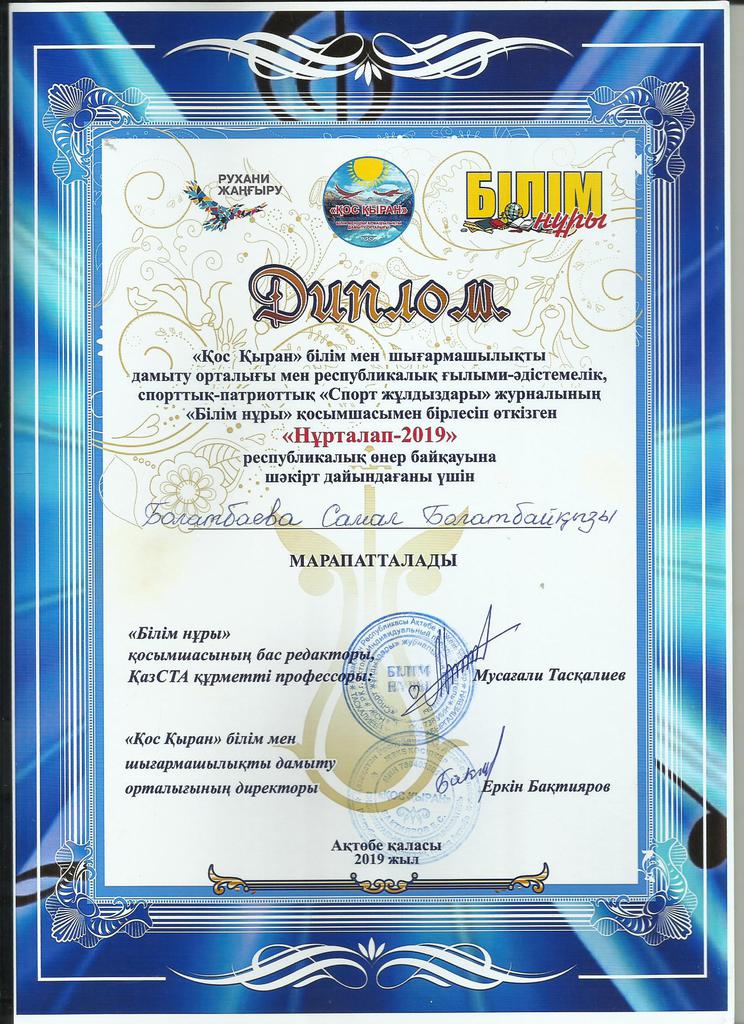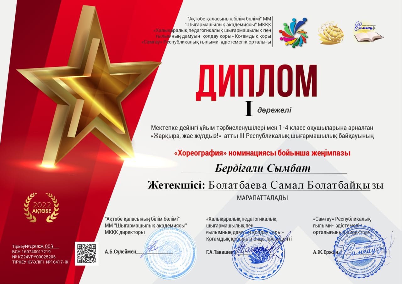 "Өрлеу" БАҰО "АК филиалы Ақтөбе облысы бойынша Кәсіби даму институты" мен "Халықаралық педагогикалық шығармашылық пен ғылымның дамуын қолдау қоры" Қоғамдық қорының ұйымдастыруымен өткен Халықаралық "ҮЗДІК АШЫҚ САБАҚ-2022" педагогикалық байқауында БОЛАТБАЕВА САМАЛ БОЛАТБАЙҚЫЗЫ 2 Дәрежелі дипломмен марапатталды.