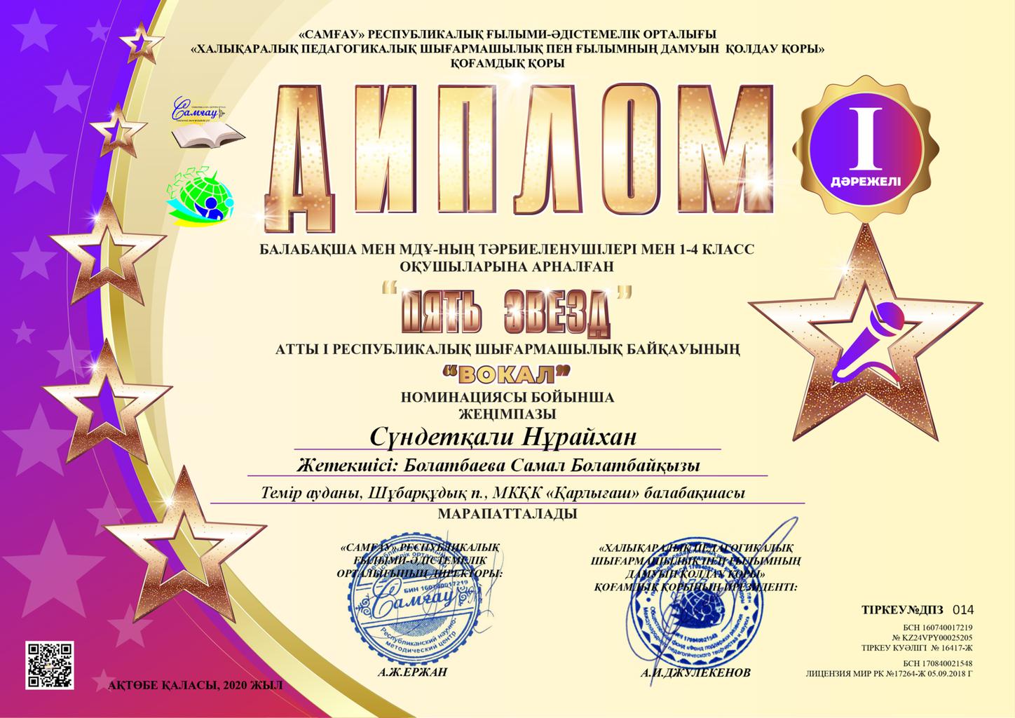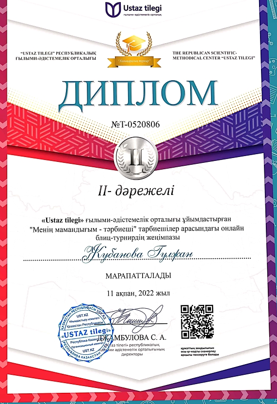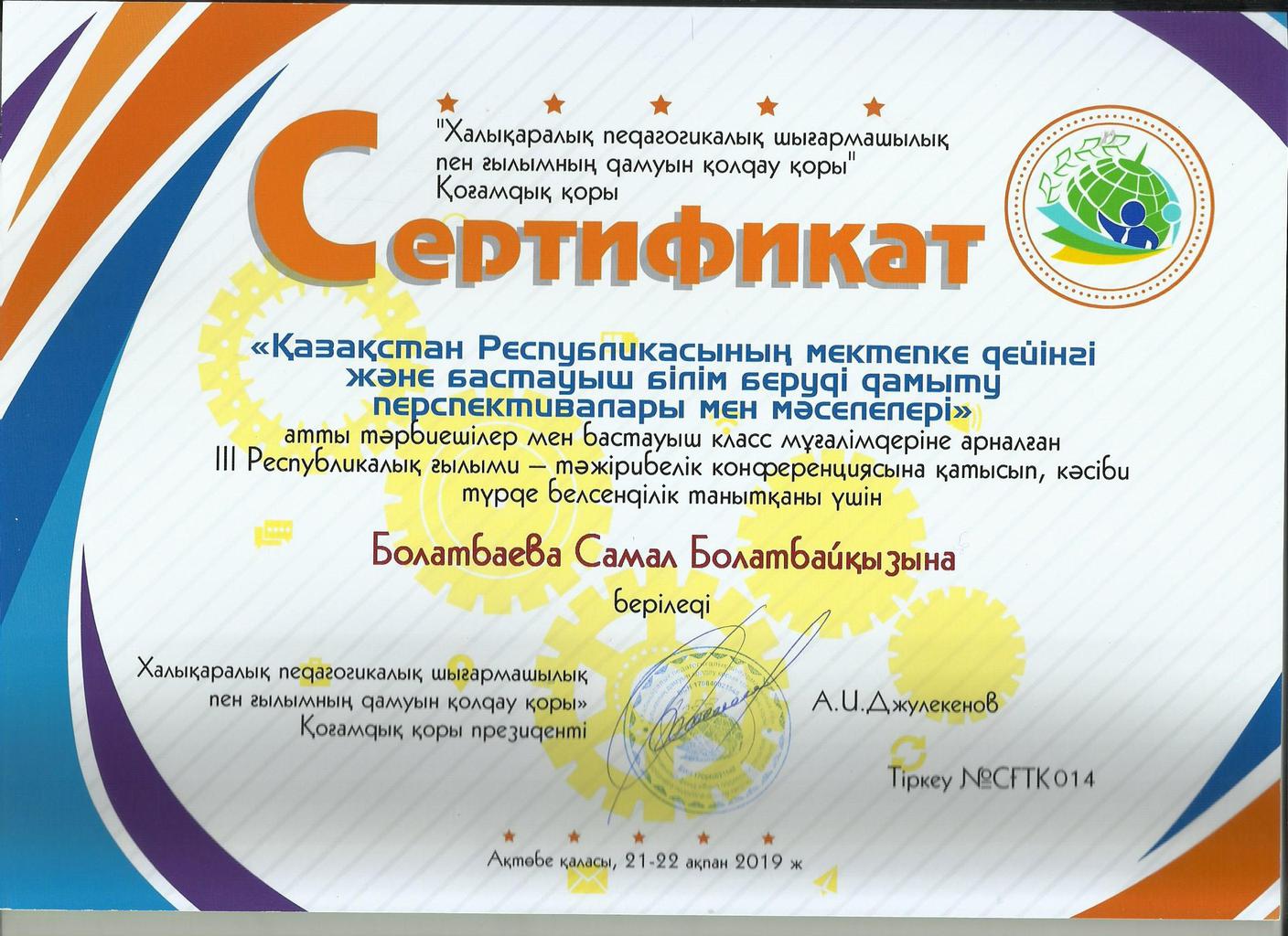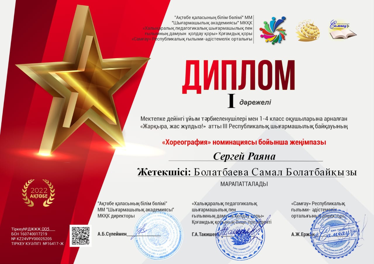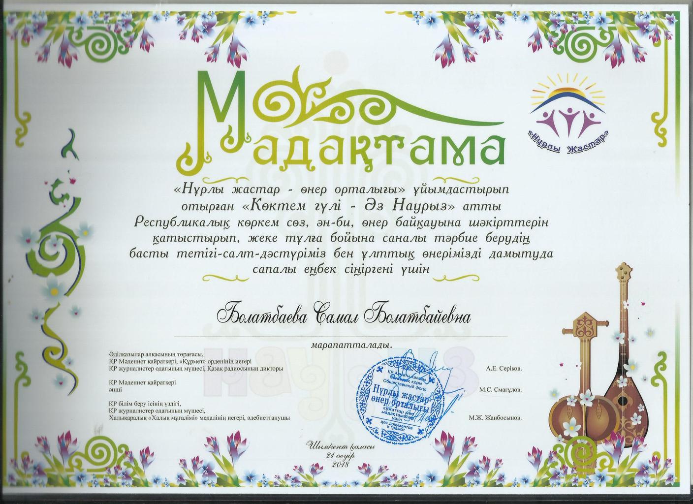 "Өрлеу" БАҰО "АК филиалы Ақтөбе облысы бойынша Кәсіби даму институты" мен "Халықаралық педагогикалық шығармашылық пен ғылымның дамуын қолдау қоры" Қоғамдық қорының ұйымдастыруымен өткен Халықаралық "ҮЗДІК АШЫҚ САБАҚ-2022" педагогикалық байқауында БОЛАТБАЕВА САМАЛ БОЛАТБАЙҚЫЗЫ 2 Дәрежелі дипломмен марапатталды.