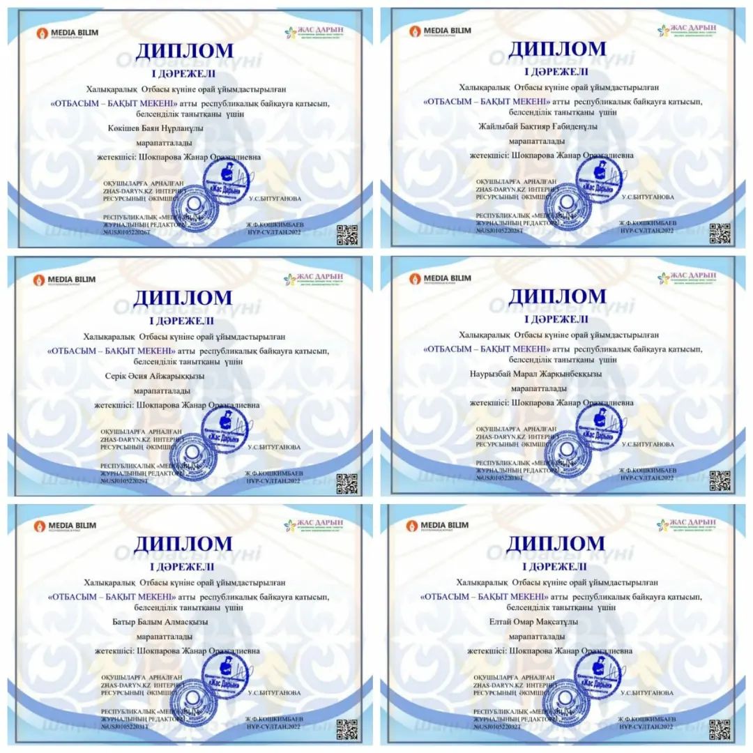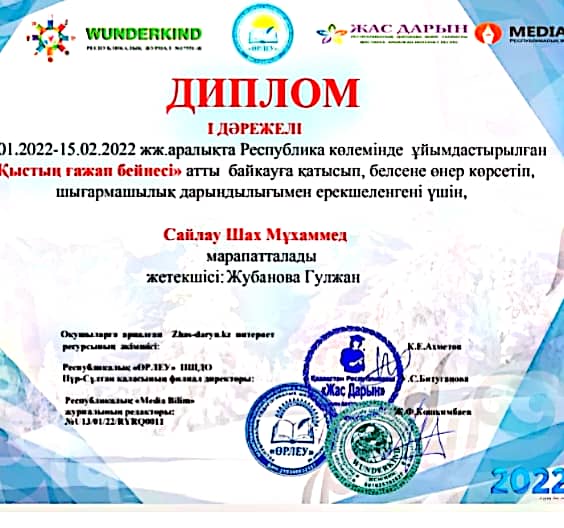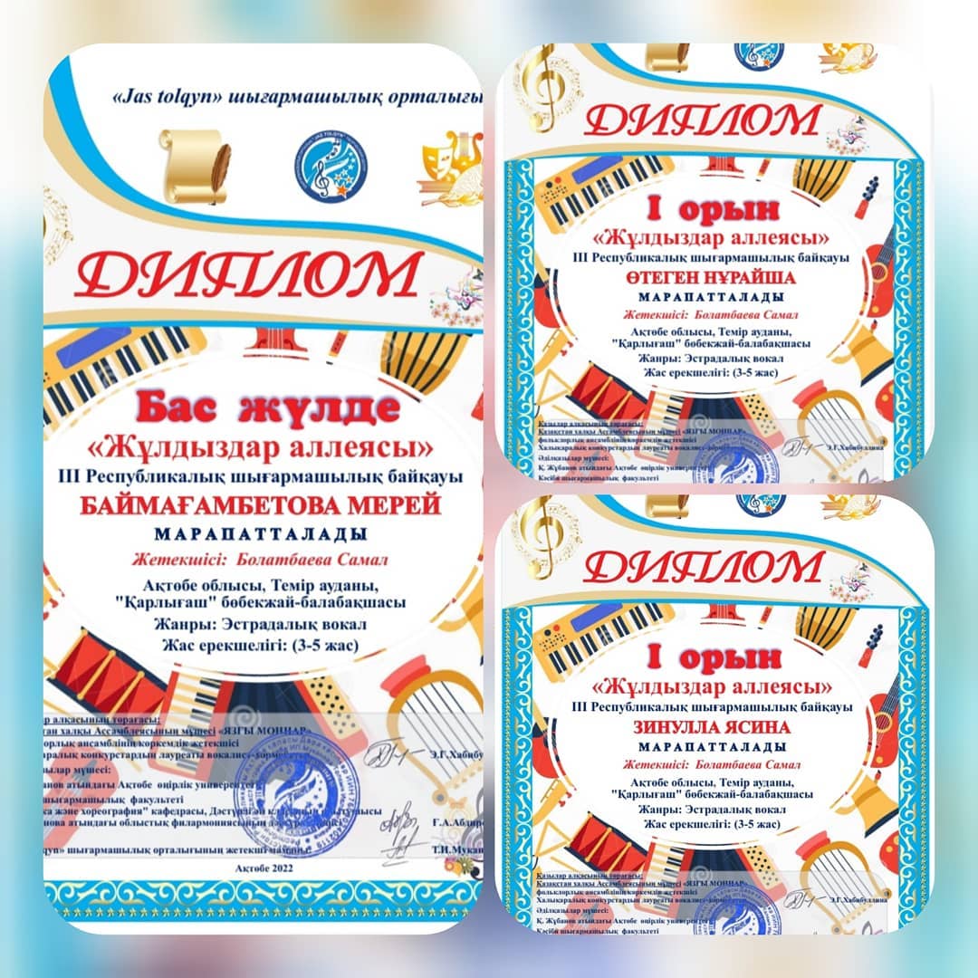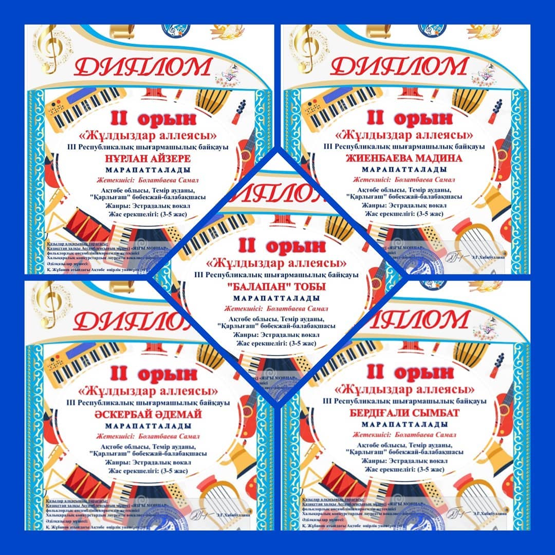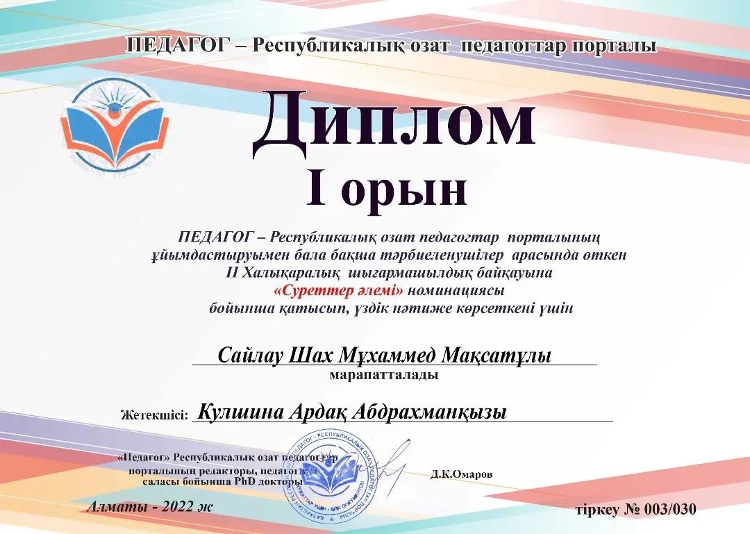 Педагог-Республикалық озат педагог порталы ұйымдастыруымен өткен балабақша тәрбиеленушілері арасында ІІ Халықаралық шығармашылық байқауына "Суреттер әлемі" номинациясы бойынша" Есімхан Көзайым мен Сайлау Шах Мұхаммед қатысып жүлделі І-орын алды.