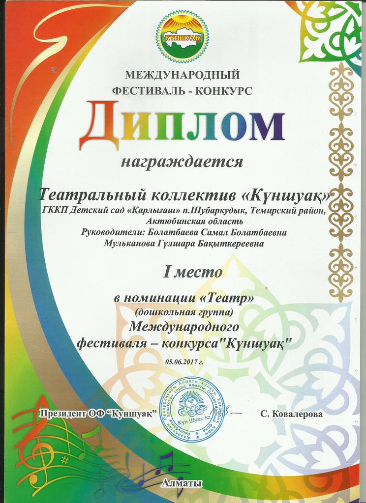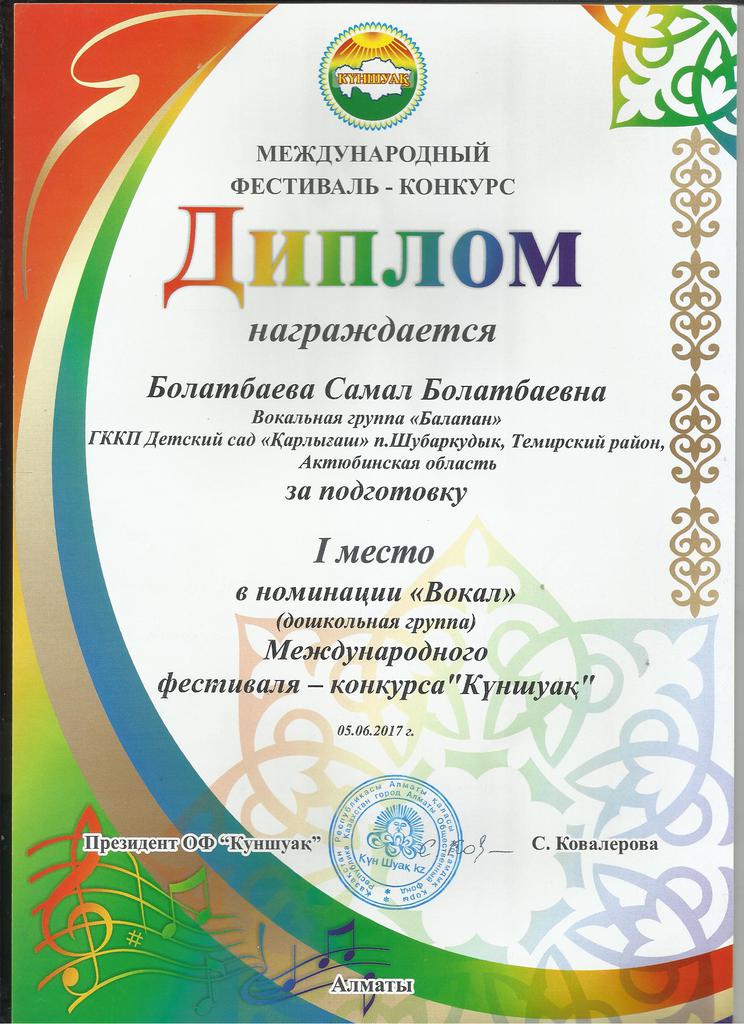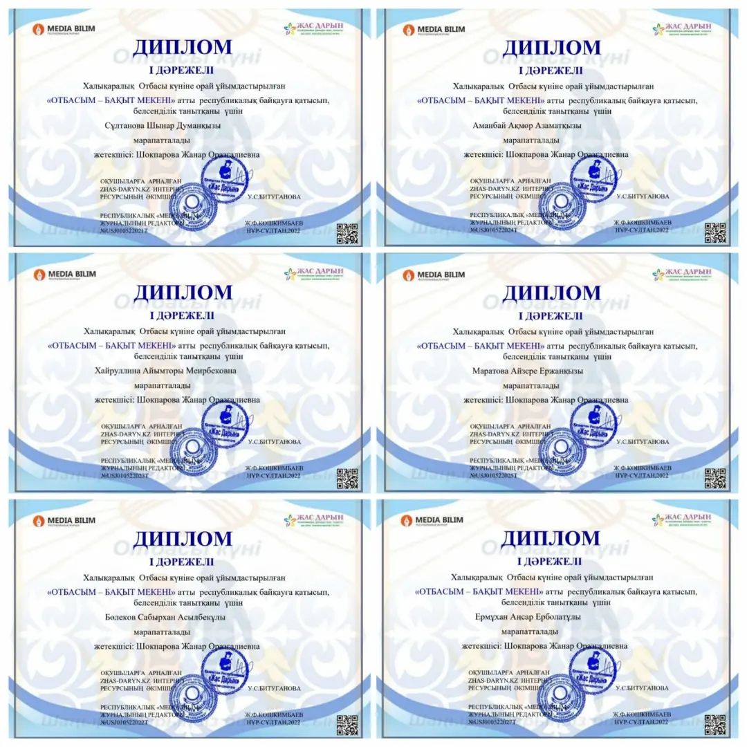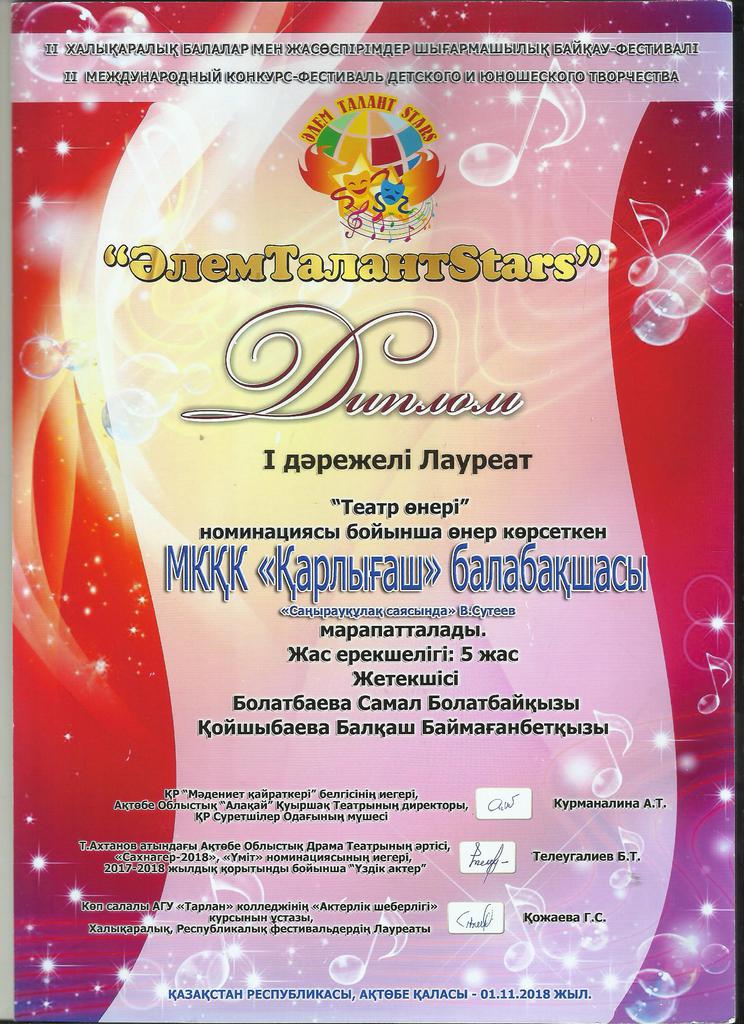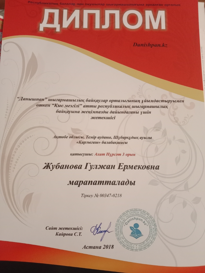 Педагог-Республикалық озат педагог порталы ұйымдастыруымен өткен балабақша тәрбиеленушілері арасында ІІ Халықаралық шығармашылық байқауына "Суреттер әлемі" номинациясы бойынша" Есімхан Көзайым мен Сайлау Шах Мұхаммед қатысып жүлделі І-орын алды.
