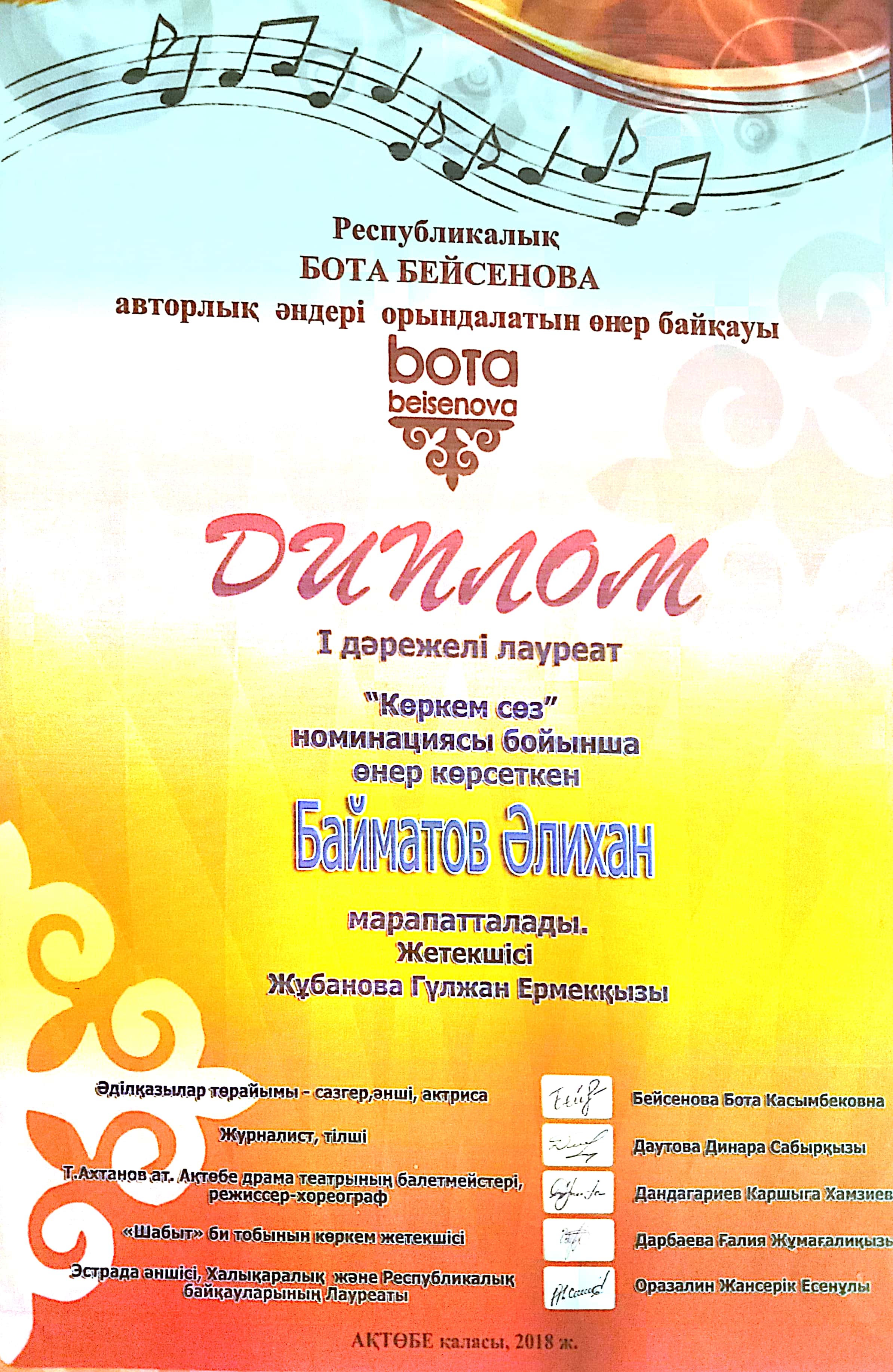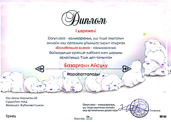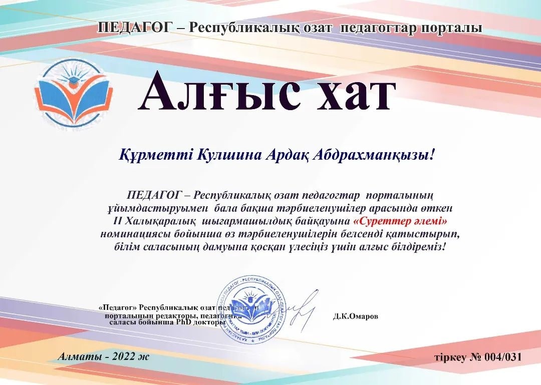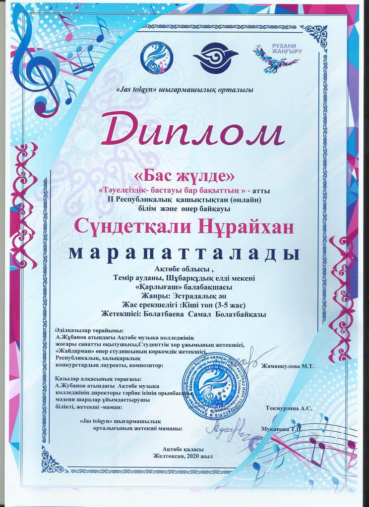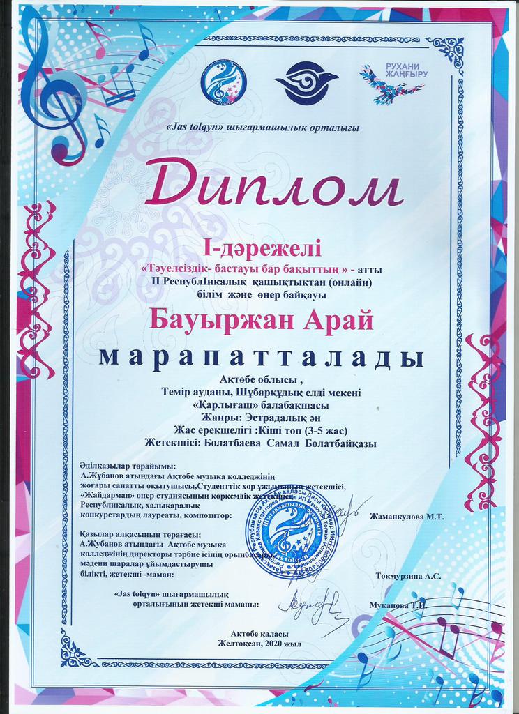 Педагог-Республикалық озат педагог порталы ұйымдастыруымен өткен балабақша тәрбиеленушілері арасында ІІ Халықаралық шығармашылық байқауына "Суреттер әлемі" номинациясы бойынша" Есімхан Көзайым мен Сайлау Шах Мұхаммед қатысып жүлделі І-орын алды.