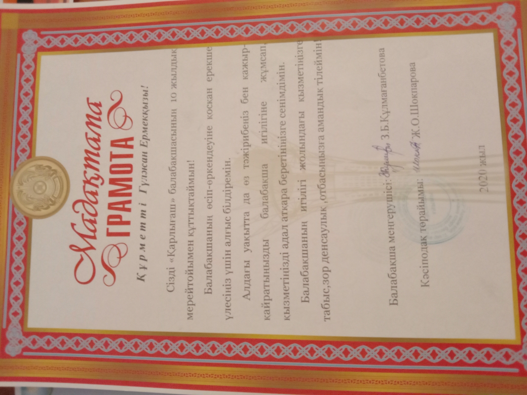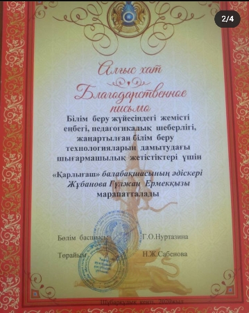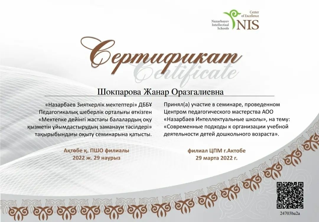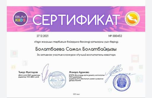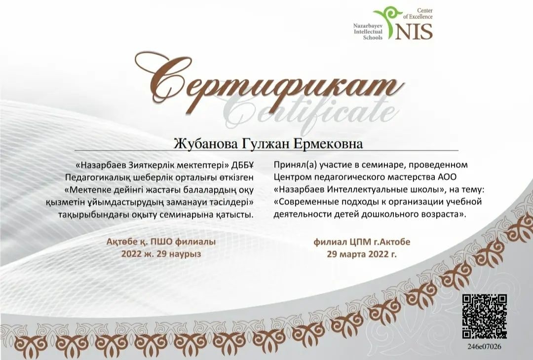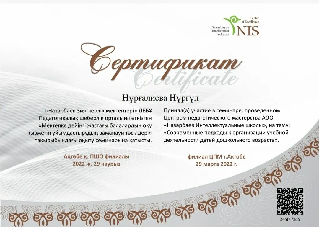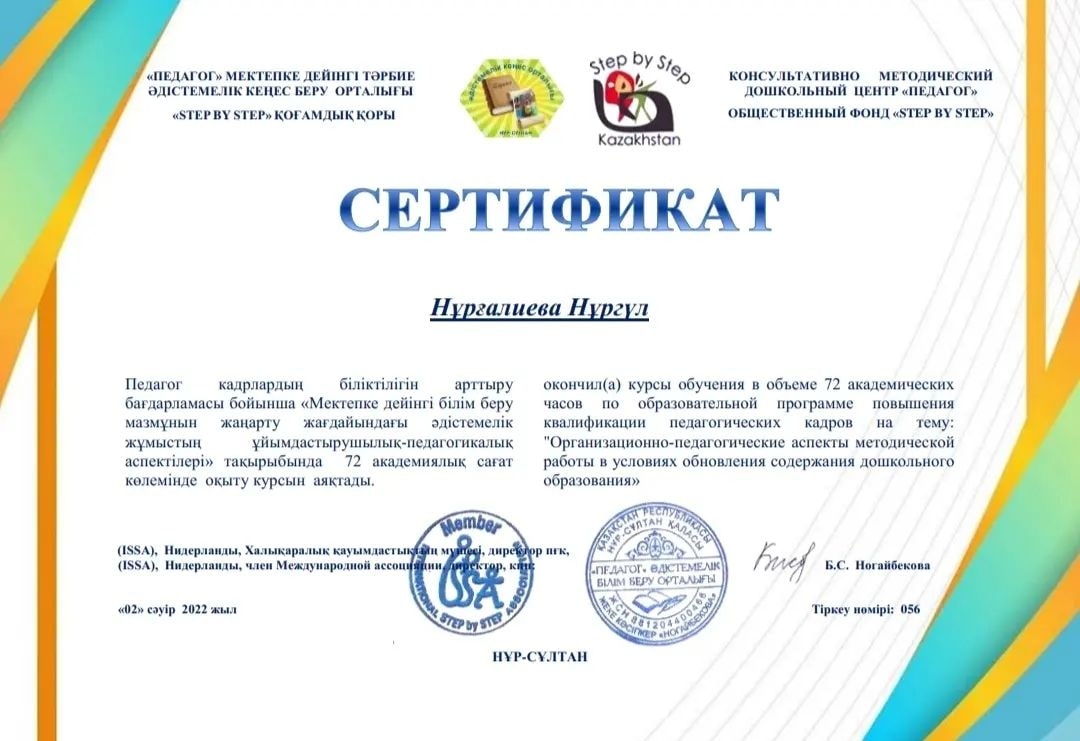 "ПЕДАГОГ" мектепке дейінгі тәрбие әдістемелік кеңес беру орталығы, "STEP BY STEP" қоғамдық қоры ұйымдастыруымен педагог кадрлардың біліктілігін арттыру бағдарламасы бойынша "Мектепке дейінгі білім беру мазмұнын жаңарту жағдайындағы әдістемелік жұмыстың ұйымдастырушылық - педагогикалық аспектілері" тақырыбында 72 академиялық сағат көлемінде оқыту курсына әдіскеріміз Нұрғалиева Нұргүл қатысып,курс қорытындысы бойынша тест тапсырып, сертификат алды.