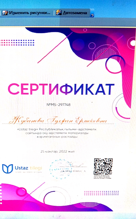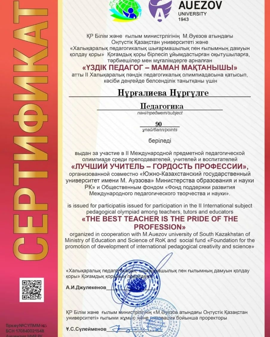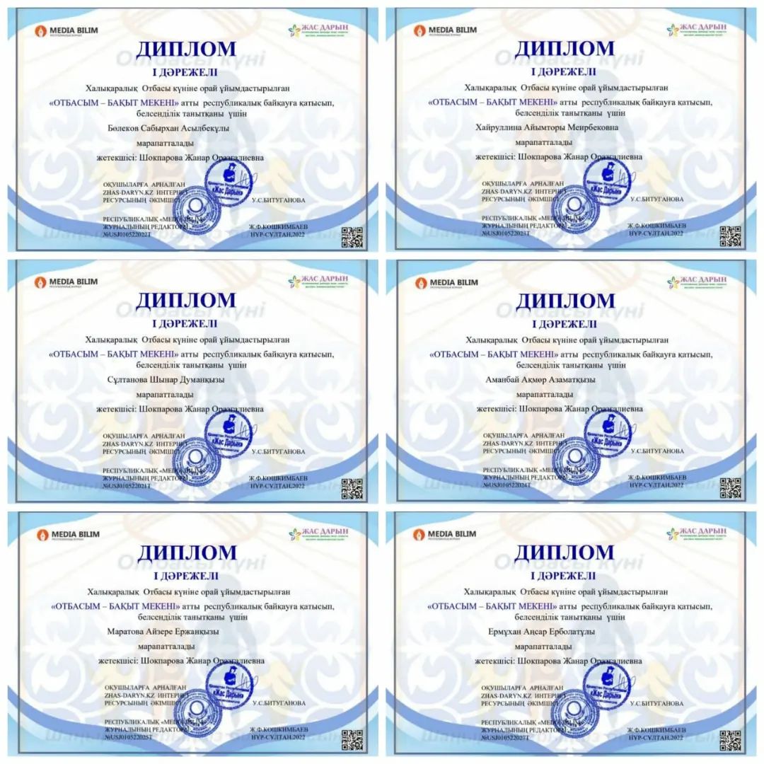 "ҮЗДІК ПЕДАГОГ-МАМАН МАҚТАНЫШЫ" атты Халықаралық пәндік педагогикалық олимпиадасына қатысып, кәсіби деңгейде белсенділік танытқан әріптестеріміз сертификат алды.