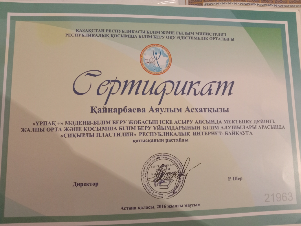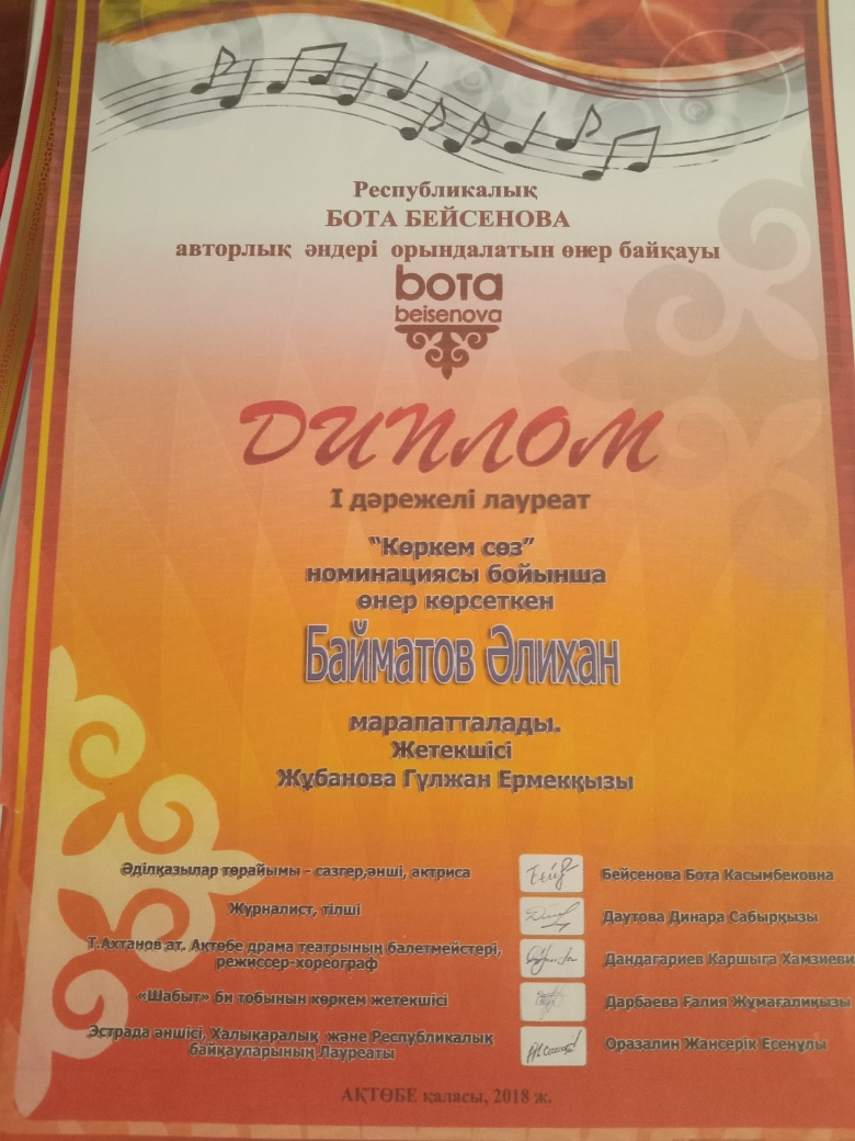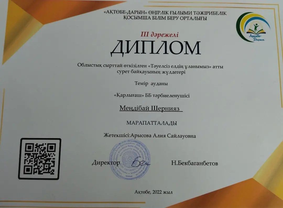 "Ақтөбе-дарын" өңірлік ғылыми тәжірибелік қосымша білім беру орталығы ұйымдастыруымен облыстық сырттай өткізілген "Тәуелсіз елдің ұланымыз" атты сурет байқауынан "Ақ бота" тобының тәрбиеленушісі Меңдібай Шернияз ІІІ дәрежелі дипломмен марапатталды. Жетекшісі: Арысова А.С.