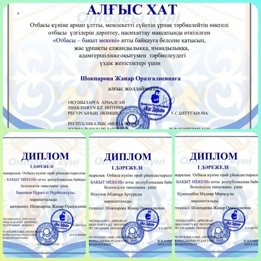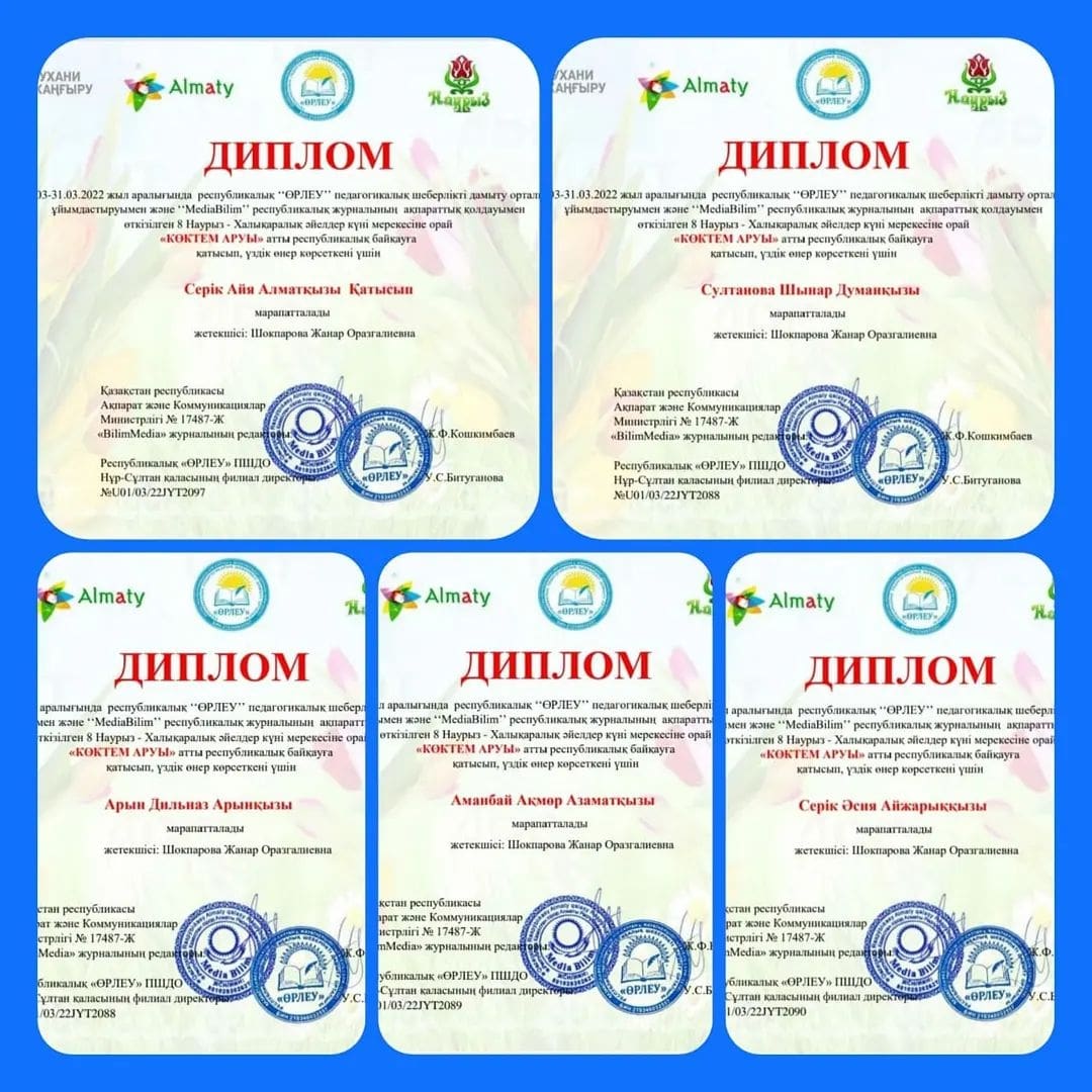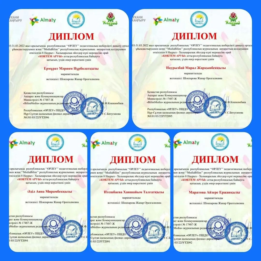 01.03-31.03.2022 жыл аралығында республикалық "Өрлеу" педагогикалық шеберлікті дамыту орталығы ұйымдастыруымен және "MediaBilim" республикалық журналының ақпараттық қолдауымен өткізілген 8 Наурыз- Халықаралық әйелдер күні мерекесіне орай "КӨКТЕМ АРУЫ" атты республикалық байқауға қатысып, үздік өнер көрсеткендері үшін "Күншуақ"тобының бүлдіршіндері марапатталды.