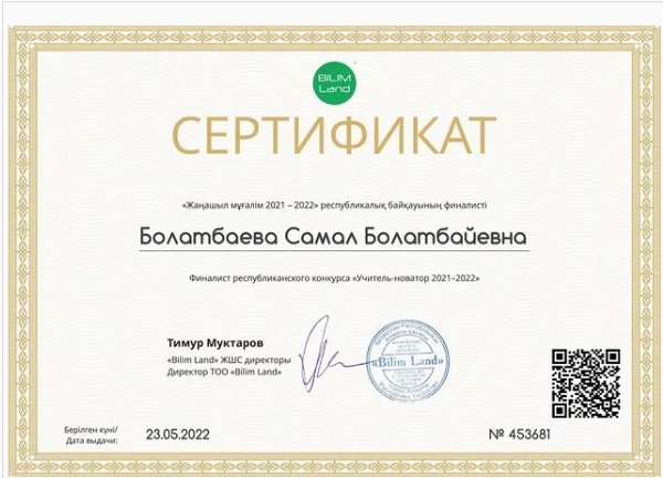 "Bilim Lanb" ЖШС сайтының, "Bilimkibs" порталында ұйымдастырылған "Жаңашыл мұғалім 2021-2022" республикалық байқауының финалисті болған әріптесіміз Болатбаева Самал Болатбайқызына шығармашылық табыс тілейміз🌷🌷🌷