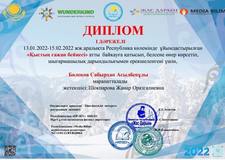 Республикалық "Дарын"ПШДО ұйымдастыруымен өткен "Қыстың ғажайып бейнесі" байқауында "Күншуақ" тобының бүлдіршіндері Іжүлделі орындарға ие болды!Жетекшілері Шоқпарова Жанар,Амантай Айнұр.
